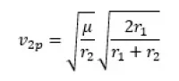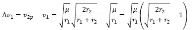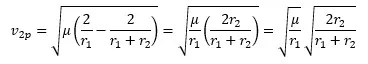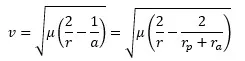 Where rp and ra are the distances to the gravitational center at periapsis and apoapsis respectively. That leads to these equations. First for velocity in the starting orbit
