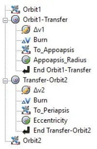 Once that is done, we need to set up our mission sequence. First, we will set up Target for the burn that gets us to the elliptical transfer orbit, with Vary command to adjust the Δv1 to correct value. After applying the impulse burn we propagate the spacecraft to apoapsis and check the magnitude of radius, RMAG, to confirm we have achieved the value of our target orbit.